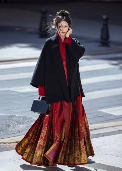 Women’s Modern Hanfu 3-Piece Wool Ma Mian Set Black/Red | HANFUBAO