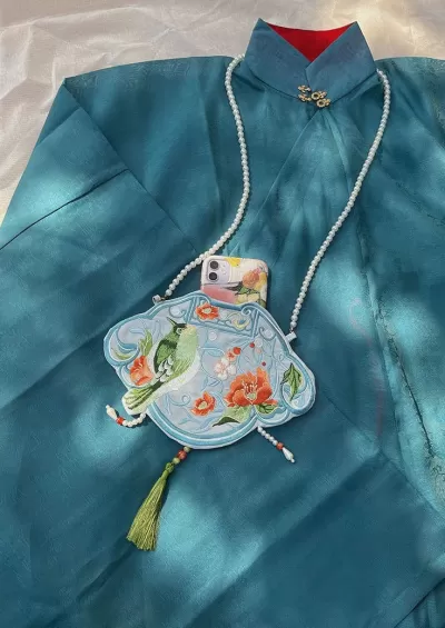 Unisex Hanfu Style Embroidered Bird Blue Crossbody Bag 17x25cm | HANFUBAO