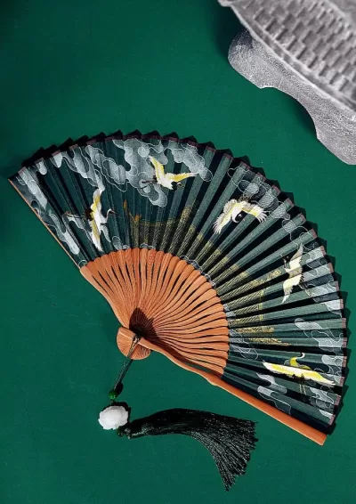 Flying Crane Folding Tassels Hand Fan, Bamboo for Hanfu Cosplay | HANFUBAO