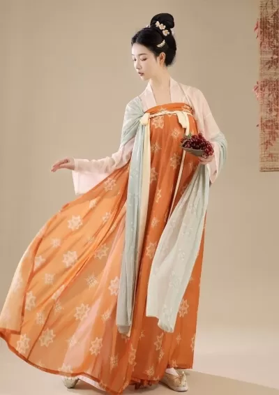 Women's Vintage Floral Embroidery Orange Chiffon Hanfu Dress Set| HANFUBAO