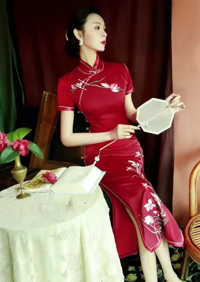 Women Modern Acetate Satin Daily Hanfu Red Magnolia Qipao Dress | HANFUBAO