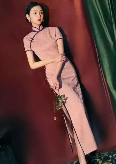 Women Acetate Satin Modern Hanfu Qipao Dress Pink Floral | HANFUBAO